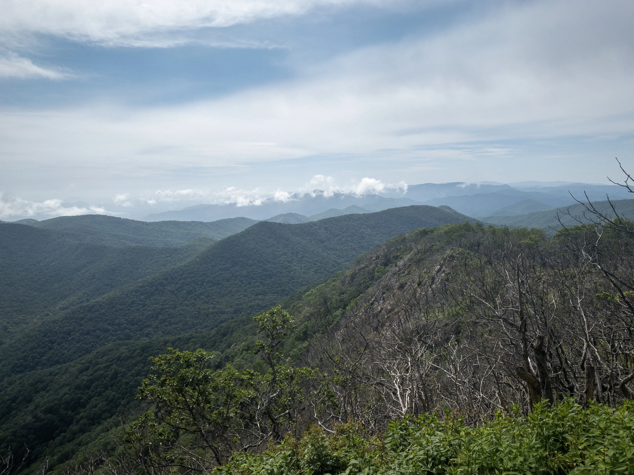 I took this break to look at Guthooks to see the distance to Standing Indian Mountain which would be my last climb of the day. I also wanted to see what the camping looked liked along the way. Carter Gap was my minimum distance to a camp based upon the mileage I had left with my target of Standing Indian shelter to make my Sunday an easy day out. Though when I looked at Guthooks, the comments mentioned a bear problem at Standing Indian shelter so ideally I would want to camp on the northern side of Standing Indian or I might be converting this overnight into a day hike. I set off from Standing Indian around 2:30 pm. The trail continued to have its overgrown patches all the way to Standing Indian. There is an intersection on the AT at this point to the spur trail to the summit of Standing Indian as well as a side trial (Lower Ridge Trail) back to the campground. I took the spur trail to the summit and was happy to see the weather had cleared a good bit but the wind was whipping a good bit. In good weather, the summit would be an amazing place to have a tent setup. Several people had already setup just below the summit so I decided not to stay here in addition to the wind. Hammock camping and wind is a great concern and being on the one of the highest mountains around with a high chance of an evening thunderstorm made me want to get to a lower elevation.